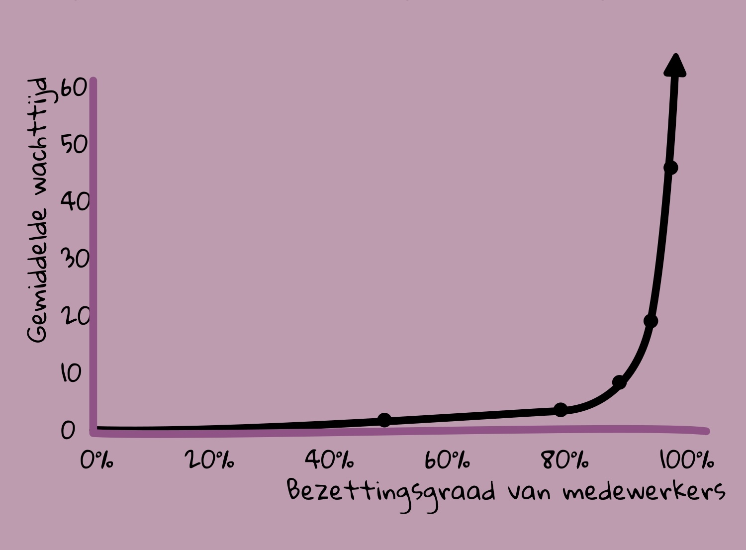 Research in queueing theory, operations management, and Lean has shown the same pattern for decades. Systems that are structurally overloaded lose their ability to cope with variation. This applies to factories and hospitals, but just as much to management teams, teams, and knowledge work. As long as the utilization rate is moderate, a system can absorb fluctuations. Small disruptions remain small. There is room to respond, recover, and learn. But as the utilization rate increases, that picture changes rapidly. The effect is not linear. That is what makes it so treacherous.